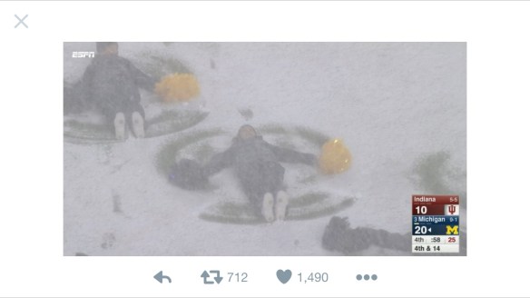 Although a little too close for comfort, the game did not disappoint and definitely kept us on our feet. The Wolverines won the game in a snow storm that completely covered the field. A great day for the team and especially for the seniors. A remarkable day for us as the Michigan cheerleaders ran out on the field and made snow angels. Angels…we could only think of you Michael, our heavenly angel.