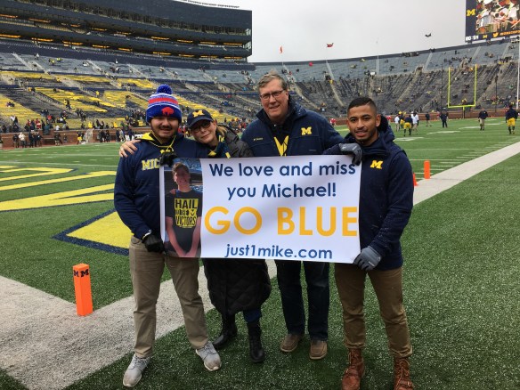 When Michael’s story was shared with both players and coaches at the University of Michigan, this dream became the motivation to honor Michael, inside the Big House on November 19th. Thank you Anna Schueler and your wonderful family as well as Henry Poggi for telling Coach Harbaugh about Michael’s passion for Michigan football. And many thanks to Coach Jim Harbaugh for inviting our family to the last home game and to J.T. Rogan who made sure we had sideline passes for pregame warmups and great seats to watch all the action. It was such an emotional, important and very memorable day for our family.